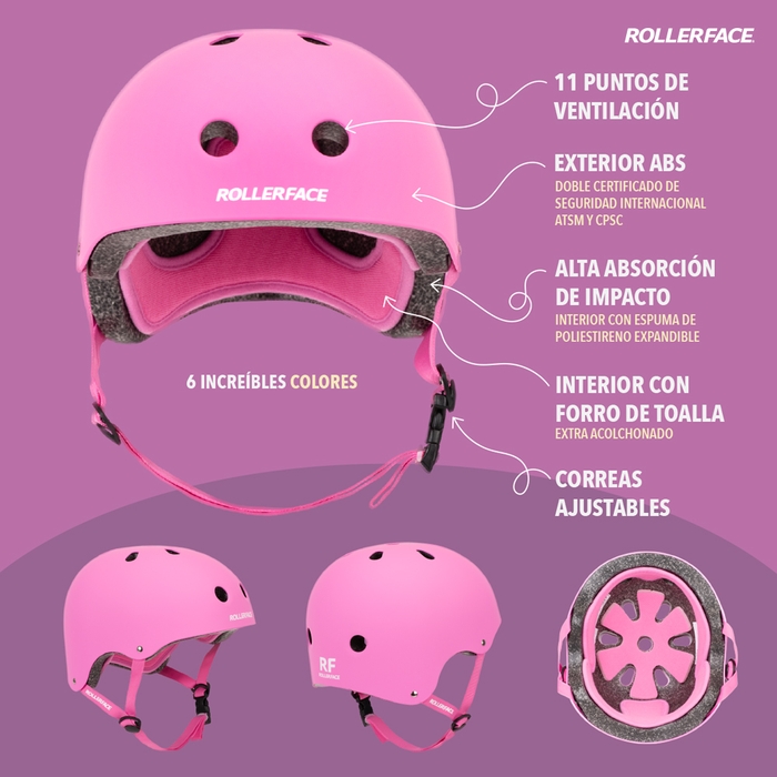 Seguro y cómodo. El nuevo casco Rollerface Multi-Sport es ideal para la práctica de deportes sobre ruedas como patinaje, patinaje en tabla, patín del diablo y bicicleta. Es muy cómodo y fresco gracias al forro interno de toalla grueso y removible que permite absorber el sudor, así como a sus 11 puntos de ventilación. Cuenta con doble certificado de seguridad internacional y alta absorción de impacto gracias al uso de espuma de poliestireno expandido (EPS). Conoce sus increíbles colores.