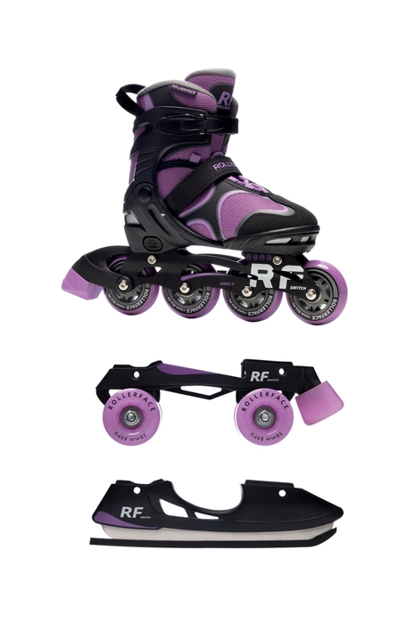 Los originales patines intercambiables Switch 3 en 1 de Rollerface son ideales para todas las edades. Patina y diviértete en la modalidad que más te guste: en línea, rollerskating o en hielo. Ejercítate patinando kilómetros en la modalidad en línea para lo cual este nuevo diseño cuenta con un marco de aluminio reforzado, baleros abec-7 y llantas de poliuretano (goma). Practica rollerdancing o disfruta largos paseos en la modalidad en paralelo con nuestras nuevas llantas Rollerface de goma de 58 mm; o bien usa tus patines para patinar cómodamente y con gran estabilidad en las pistas de hielo. Para las tres modalidades usa la misma bota acolchonada. Tus patines te durarán muchos años ya que todos sus componentes son de alta calidad y la bota es ajustable a tres tallas.